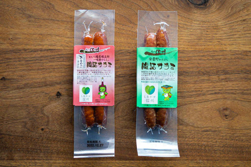 さて、続いては、爽やか信州 腸詰サラミ(わさび味、一味唐辛子味)です。