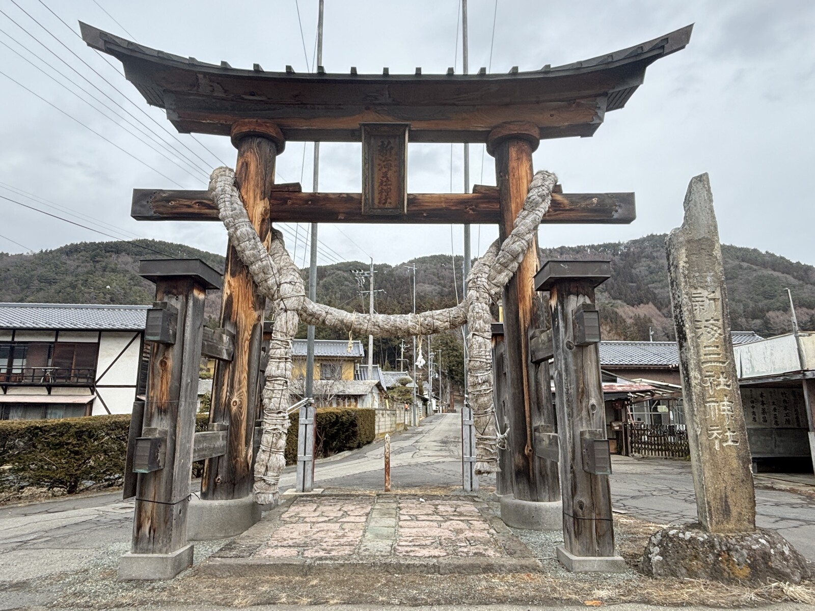 注連縄のようなものが鳥居に巻き付いていて、珍しい印象です。なぜこのようになっているのか気になります・・!