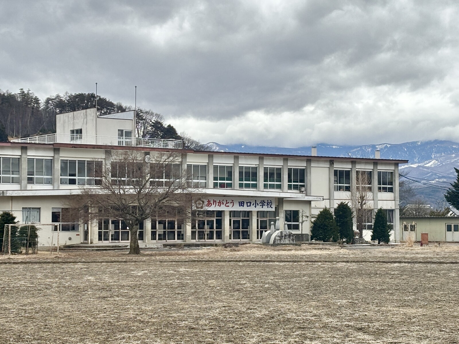 「ありがとう 田口小学校」の幕が玄関に掲げられ、学校は今もそのままの姿で佇んでいました。