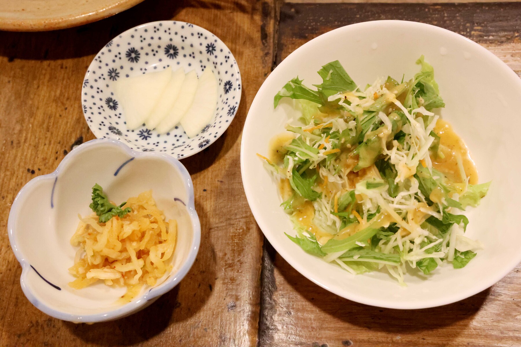 水菜やキャベツなどが入ったシャキシャキのサラダも美味!