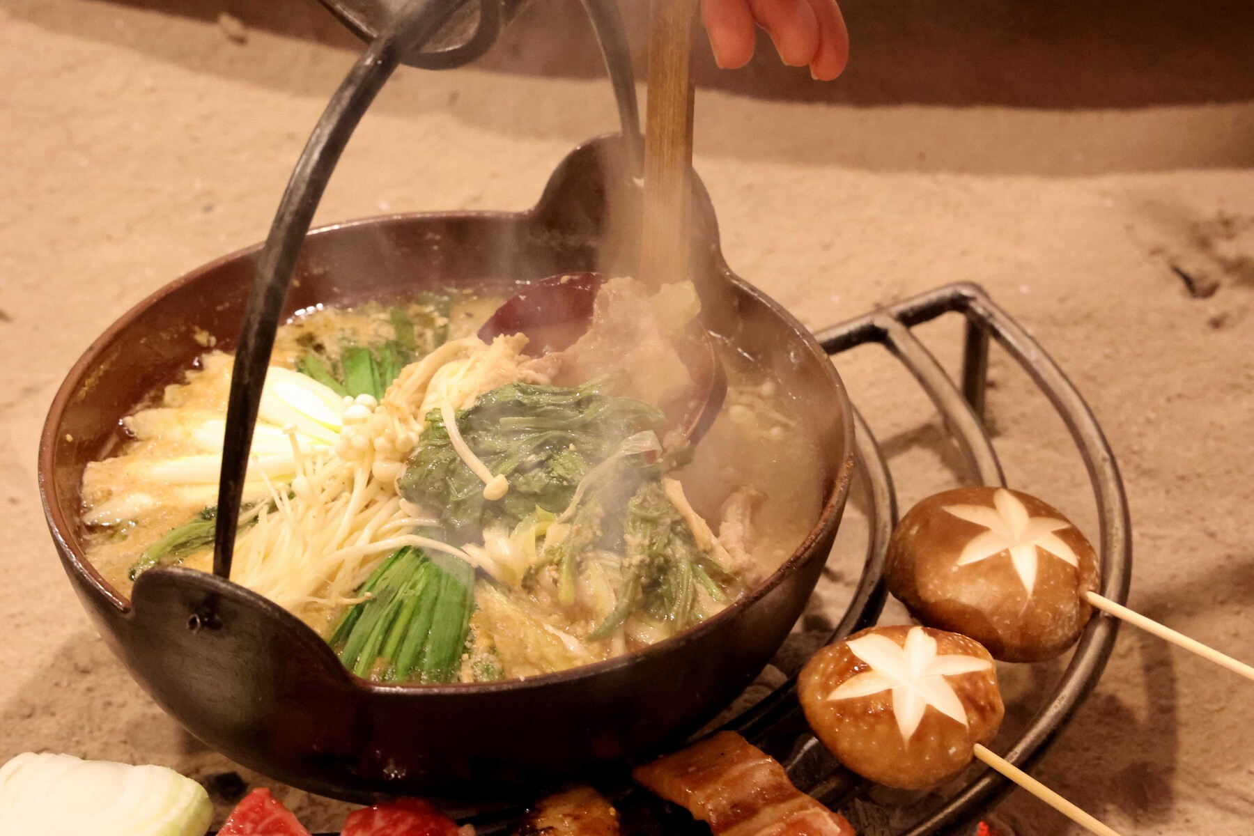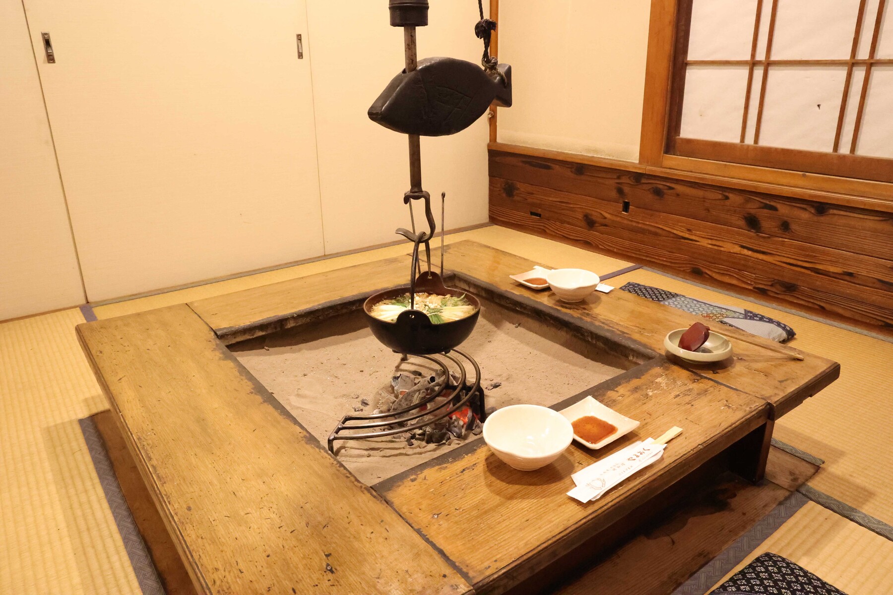 そしてメインの鍋です。囲炉裏に炭火で火を起こし、自在鉤にかかった鍋にはぐつぐつと野菜や肉が煮込まれており、見た目から食欲をそそります。