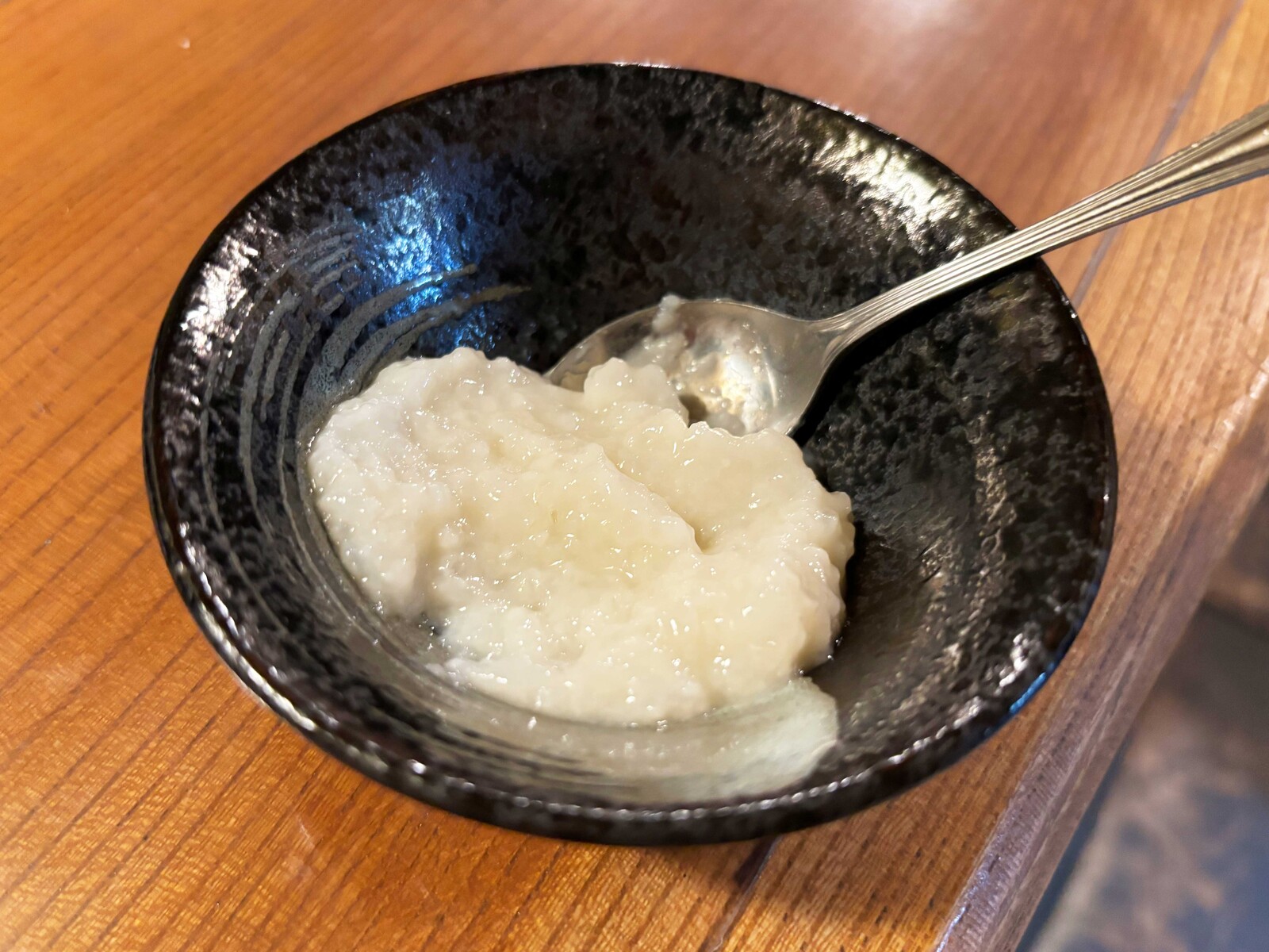 デザートにある佐久市の郷土料理「おなっとう」を特別に試食させてもらいました。米と麹を混ぜて発酵させ、冷やして食べるスイーツ。食べる甘酒という感じで、やさしい甘さが食後に合います