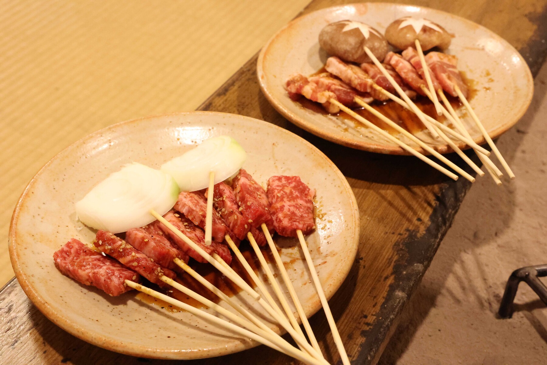 そして牛とイノブタの串焼き。囲炉裏の五徳に直接載せて、炭火でじっくり時間をかけてふっくらと両面焼き上げます。