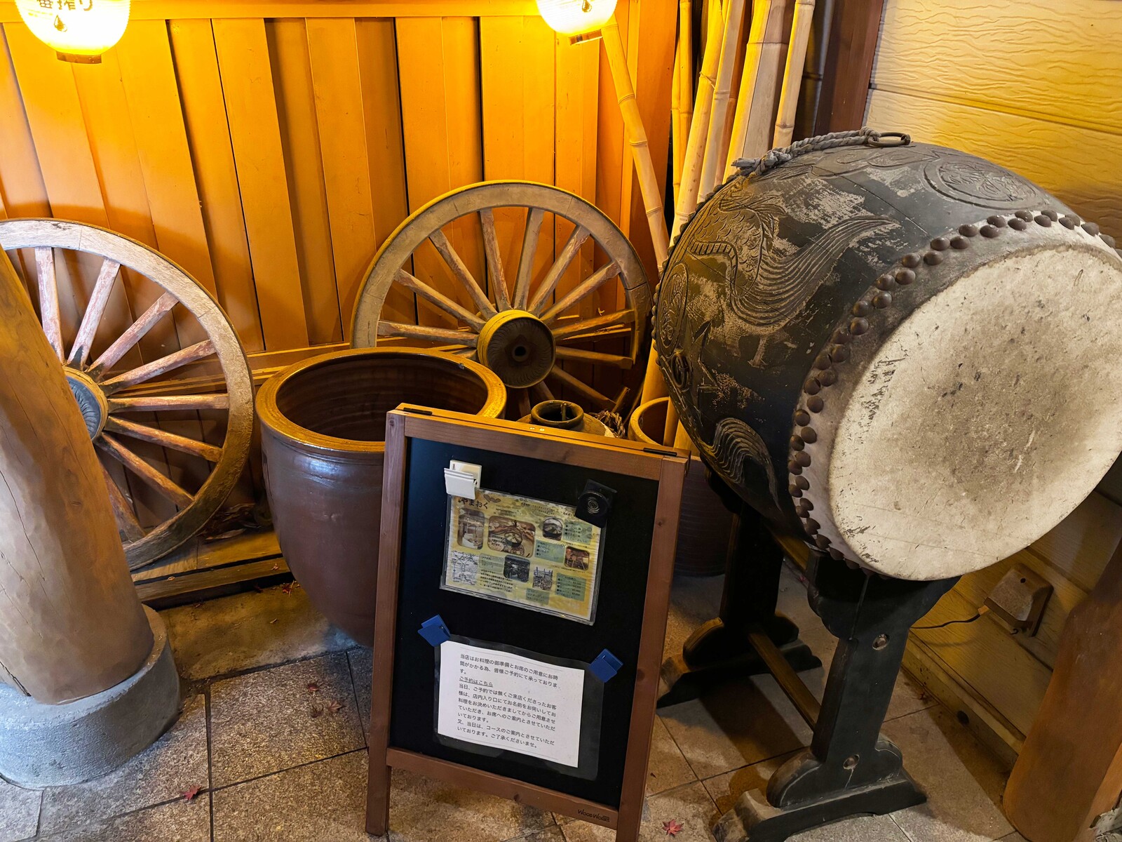 「店に合いそうだから」と、常連さんが置いていった太鼓や車輪。先代から大切に店先に飾っています