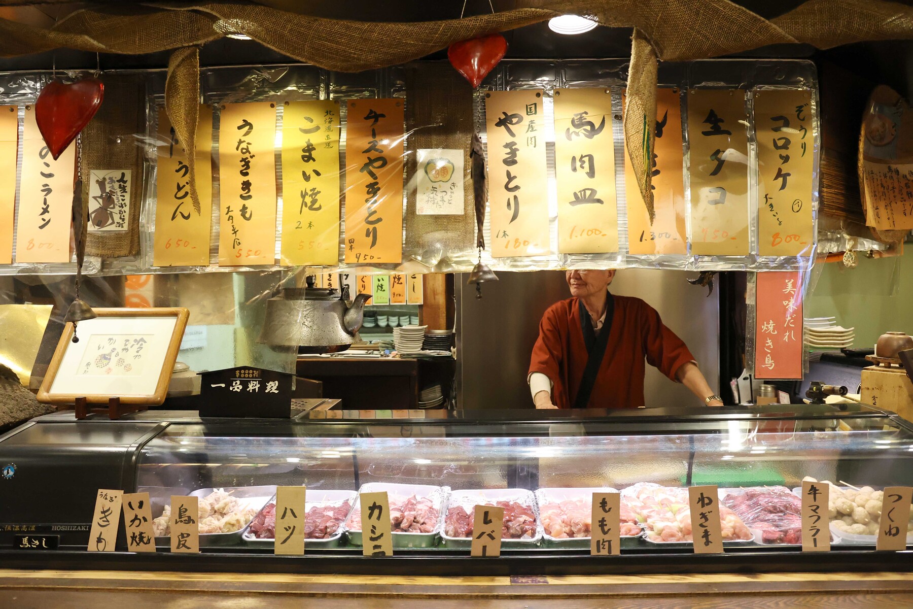 カウンターと座敷が設けられた店内は、短冊のメニュー、焼き鳥の肉が並ぶショーケースなど、大衆酒場の雰囲気が漂います。